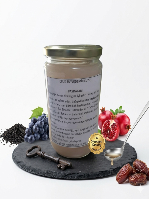 Geleneksel tıp literatüründe "Çelik Suyu" olarak anılan bu özel formül, adını insan vücudunu bir çelik kadar dayanıklı ve kuvvetli hale getirme özelliğinden alır. İbni Sina’dan Lokman Hekim’e kadar kadim hekimlerin reçetelerinde en üst sırada yer alan Demir Suyu, modern yaşamın getirdiği kronik yorgunluk ve demir eksikliğiyle mücadele etmek için tasarlanmış doğal bir iksirdir.